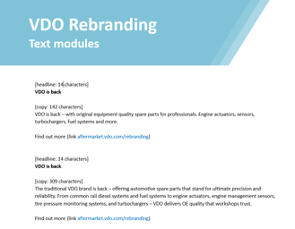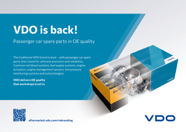 Nell'ambito di questo riallineamento, un marchio tradizionale festeggia il suo ritorno: VDO torna nel settore dei ricambi. L'intero portfolio di elettronica e meccatronica, precedentemente commercializzato con il marchio Continental, sarà in futuro nuovamente offerto con il marchio VDO, inclusi packaging e brand identity.